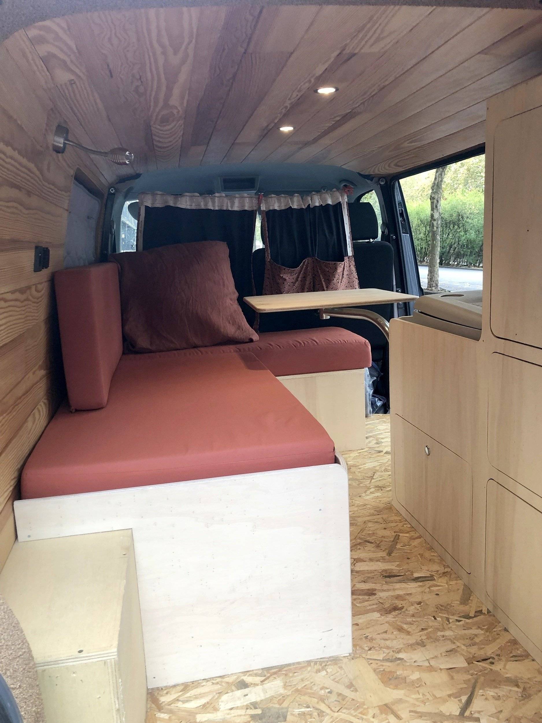 Le van a été aménagé par nos soins en 2021 avec des matériaux de qualités et écologiques, bien isolé (liège projeté, laine de chanvre) et habillage en bois sur frein vapeur, autonomie électrique (batterie externe rechargée par un panneau solaire qui est sur le toit, également par l'alternateur et éventuellement si vous allez en camping par une prise extérieure).