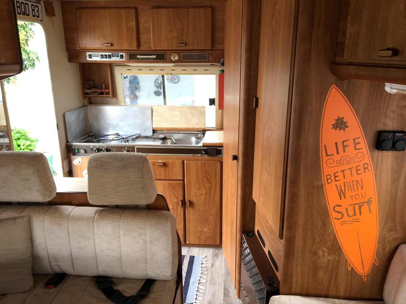 Although the motorhome is already a bit old is in very good shape and it delivers everything you need for a perfect holiday. We loved the big panoramic front window and all its vintage retro look.