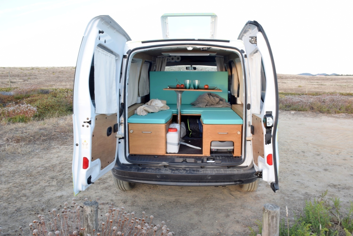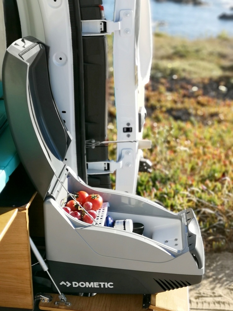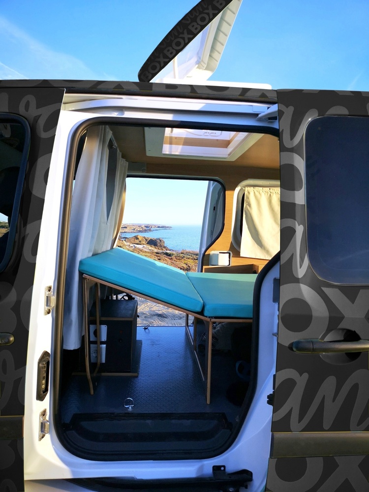 A BOX dispõe de duas gavetas que abrem para o exterior, com fogão e geleira termoelétrica, para poderes preparar as tuas próprias refeições. No interior da VAN, poderás transformar a BOX em sofá, com mesa e bancos laterais que te vai permitir descansar após uma viagem ou apreciar o que acabaste de confecionar.