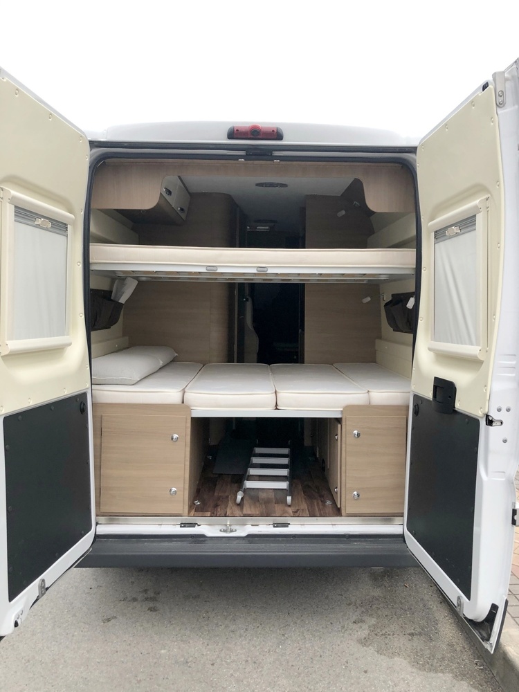 La vida en el interior es muy fácil y cómoda ya que cuentas con mesa con extensor, asientos delanteros giratorios, cocina con dos fuegos, fregadero, baño completo (WC, labavo y ducha), nevera, dos literas dobles (se pueden montar y desmontar las mismas en base a vuestras necesidades), calefaccion Webasto, agua caliente, algo de menaje , kit de limpieza, químicos de WC.