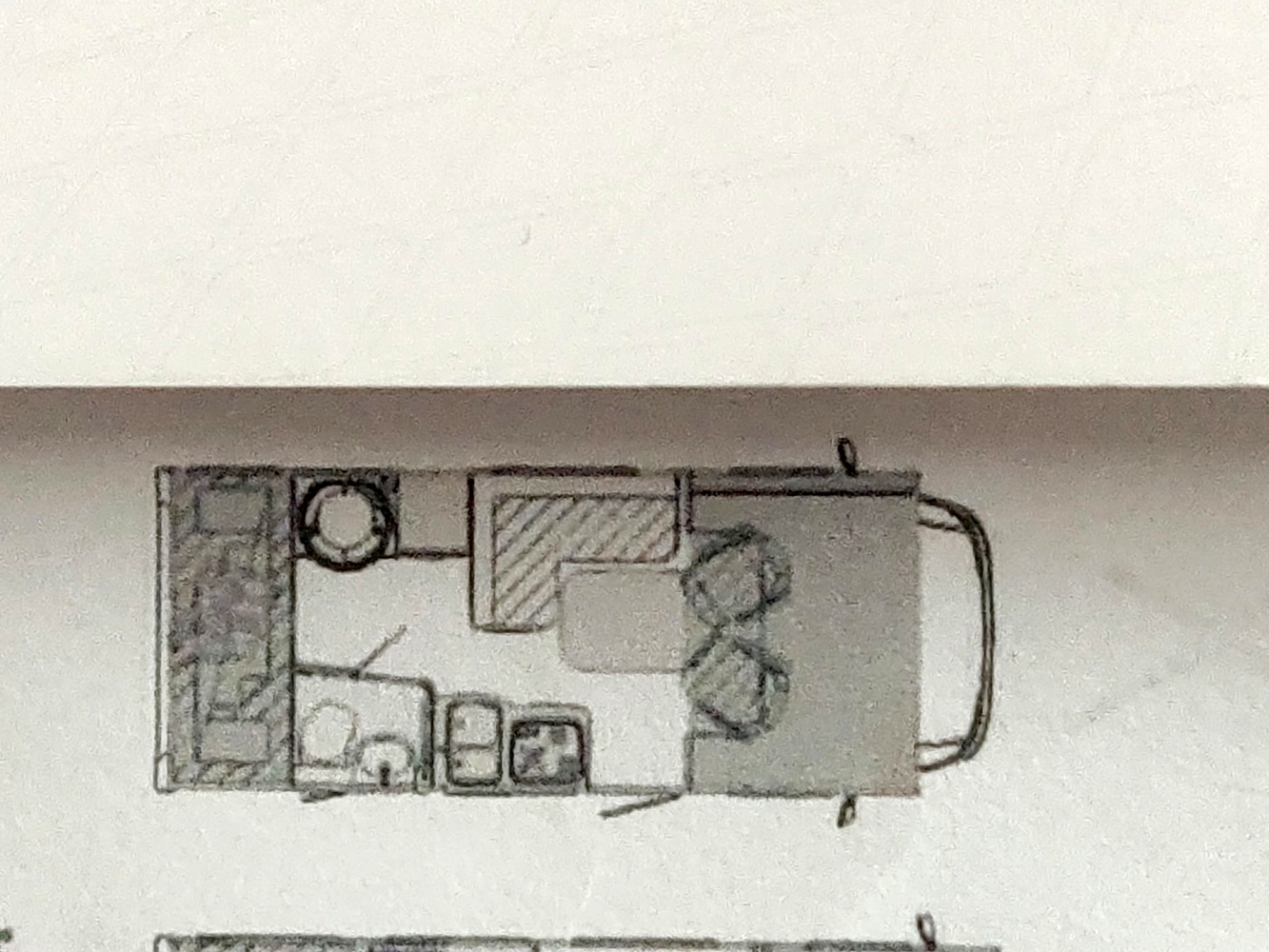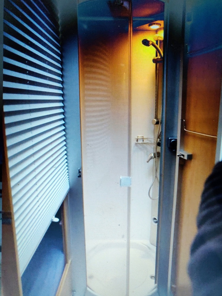 Es hat ein abteilbares Raumbad mit separater Dusche Spiegelschrank und Waschtisch. Im Bad ist ein Lüfter in der Decke. Auf dem großen Hubbett mit einer Breite von 1,40 m x 1,96 m finden 2 Personen bequem Platz. Schnarcher könne auch getrennt im Heckbett schlafen. Im Heck ist ein Etagenbett, jeweils 80 cm breit und 210 cm lang, das untere Bett kann hochgeklappt werden. Dann entsteht eine große Heckgarage für zwei Fahrräder. Markise, zusätzlicher Fahrradträger möglich, Tisch und Stühle, Kühlschrank mit Eisfach und weitere nützliche Campingausstattung mit Töpfen und Geschirr usw..