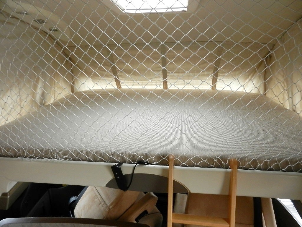 Le lit au dessus du poste de pilotage est protègé par un filet pour éviter la chute des enfants.